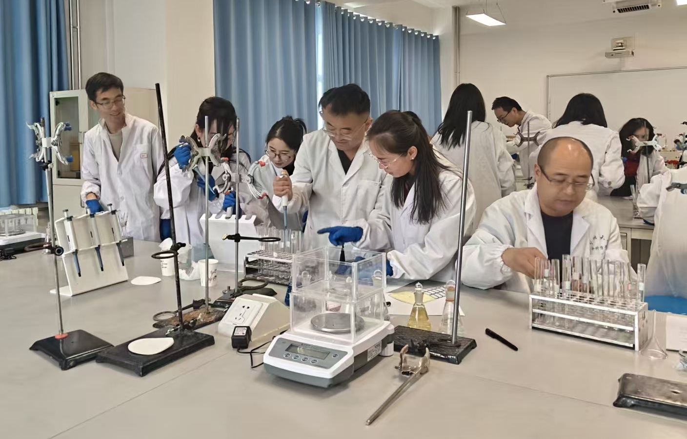 下午,王慧春教授继续开展“酶的高效性与特异性验证”定量实验。通过设计多底物对比实验,利用分光光度计测定酶促反应速率并绘制动力学曲线,将高中常见的定性实验延伸至定量研究层次,强化了科学探究方法的系统训练。此外,参训教师还共同回顾了减数分裂、植物根尖有丝分裂等基础实验的教学要点,进一步夯实了实验教学基本功。