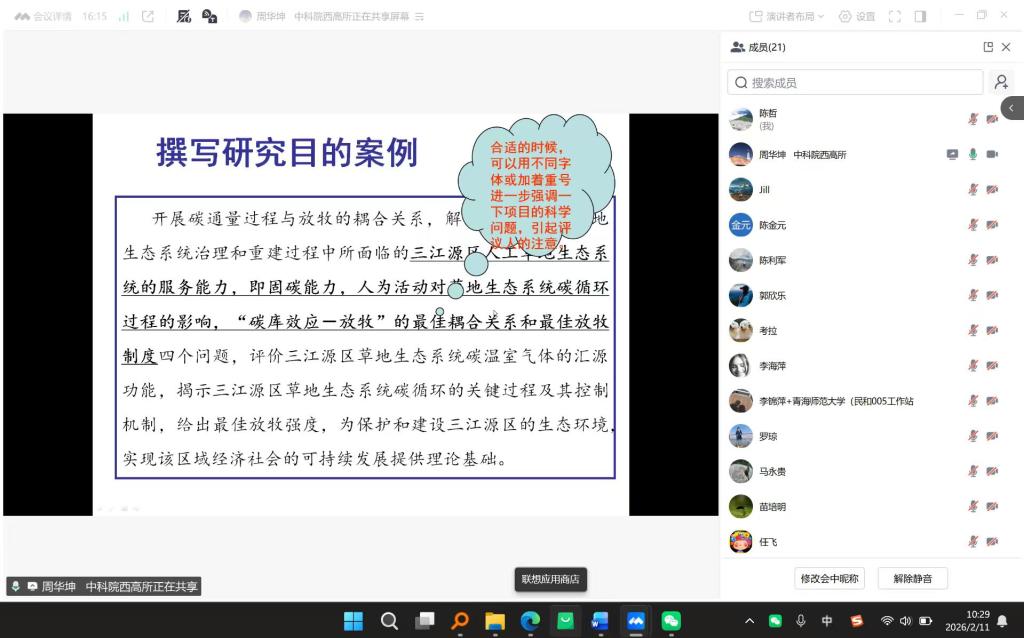 周华坤研究员以《申请国家自然科学基金的一些体会和认识》为题,结合自身多年申请和评审经历,从政策导向、基金架构、同行评审、选题切入点、立项依据、研究基础、创新点等方面进行了系统深入的分析。深度解读了2026年国家自然科学基金评审新动向,系统介绍了申请书各环节撰写要点,分享了“准、精、实、细”四字心得。在互动环节,周华坤研究员就申报教师提出的问题,结合教师申报书文本给出了建设性修改意见。