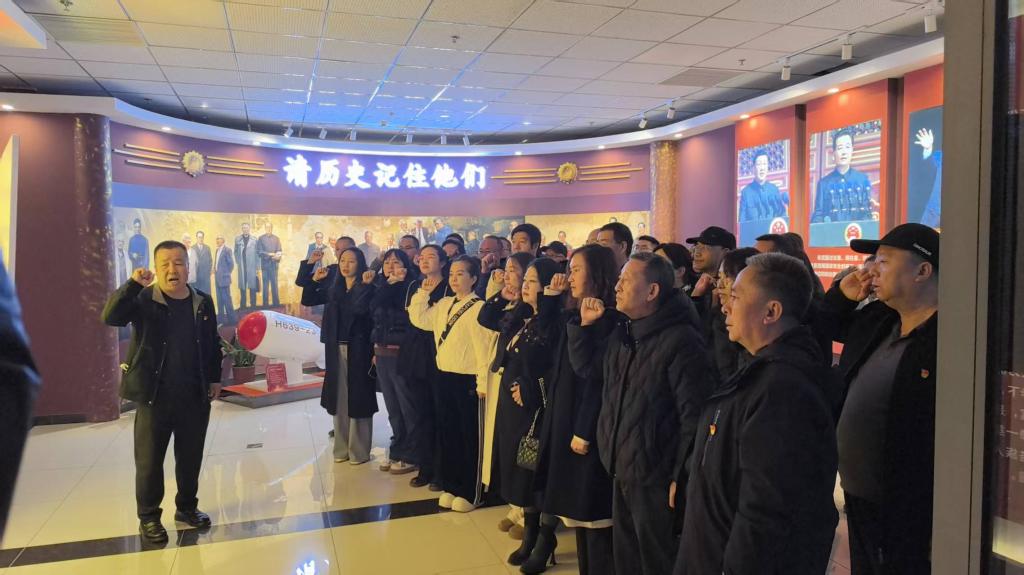 在展览馆庄严的氛围中,全体党员共同面向鲜红的党旗,高举右拳、庄严宣誓,重温入党誓词。